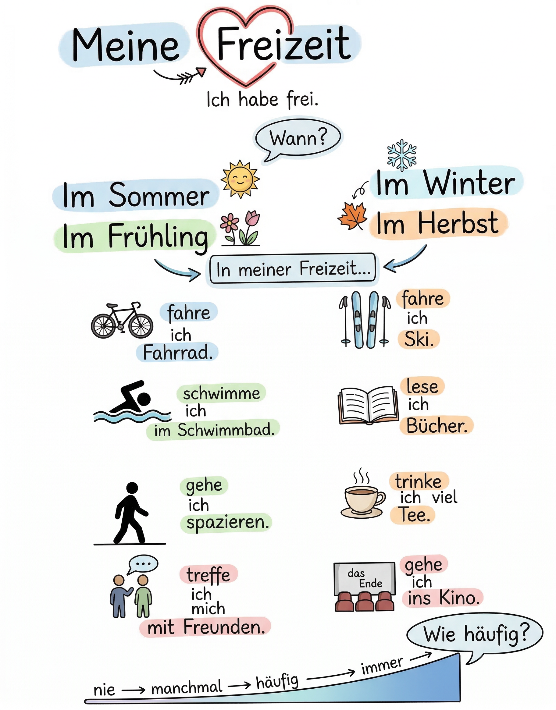 Niemcy rzadko mówią o swoim czasie wolnym. Jednakże, jeśli o nim mówią, to tak, aby opisać swoje zainteresowania w paru zdaniach. Naucz się tych zdań porządnie! 🙂