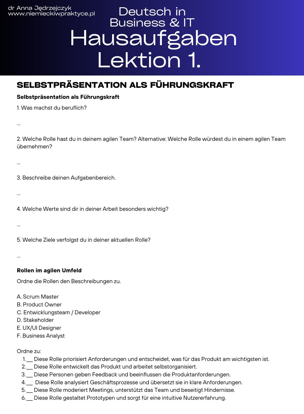 Każda lekcja opiera się na praktycznych scenariuszach – dokładnie takich, jakie pojawiają się w niemieckojęzycznych firmach i projektach IT. Jest miejsce na pytania, ćwiczenie wypowiedzi i korygowanie błędów na bieżąco.